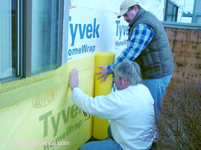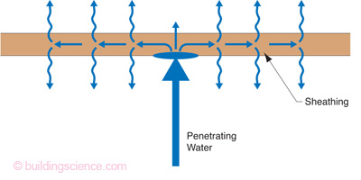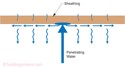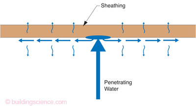 문제가 생기는데, 이런 경우라도 OSB를 덮은 하우스랩과 외장재인 스타코 사이에 적절한 공간이 있다면 물이 사방으로 퍼지고