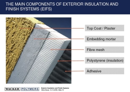 아래 그림은 한때 미국에서 유행했던 외부 마감방법인 EIFS 공법이라고 합니다.