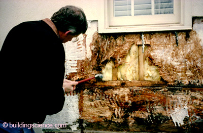 약 30년전에 벽체의 마감을 합판과 종이에 아스팔트를 바른 펠트지를 사용했을 때 비가 들이쳐 물이 스며들었다면