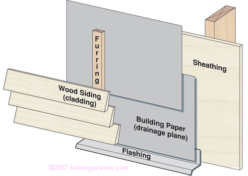 이 배수면의 전형적인 형태는 비를 바로 맞는 외장 사이딩의 뒷면에 설치되는 빌딩페이퍼와 벽체 하단에
