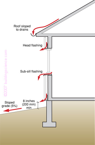 가능하면 모든 창과 문의 상단에도 플러슁을 설치하는 것이 배수에 도움이 된다.