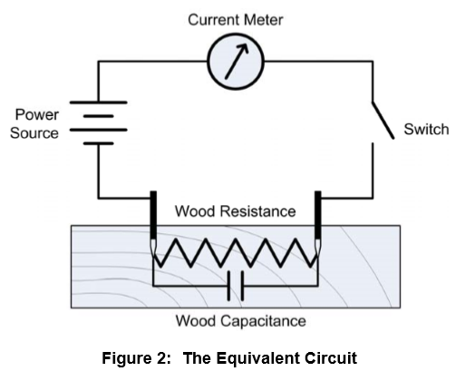습도계의 측정원리는 아래의 그림과 같이 두 개의 탐침봉 사이에 전류를 흘러보내 그 저항값을 가지고 측정을 한다.