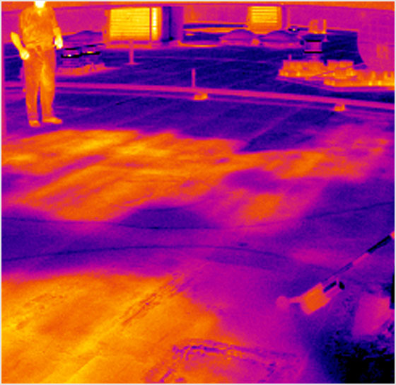아래 열화상 사진은 미국 아리조나주에서 대규모로 발생하였던 평지붕들의 하자에 대한 사진이다.