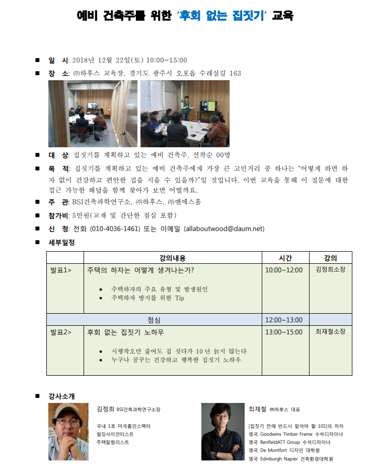12월 주말건축교육, 하자없는 집짓기 과정 신청받습니다.