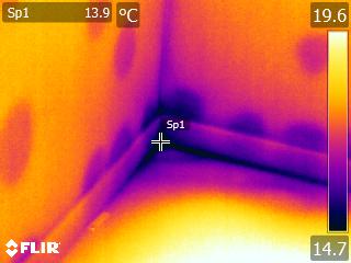 방 한쪽 구석을 검사해 본다. 이미 온도가 결로가 생길 온도 부근에 가 있다.